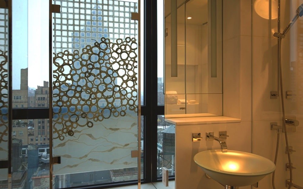 「和紙ラミネートガラス」は、職人の手によって創られる本物の和紙を、自然な風合いを残しながらヨーロッパのUVカットガラスに特殊な接着方法で挟み込んが、ニューヨークで製作される装飾デザインガラスです。