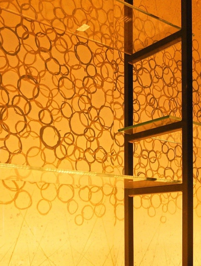 ご紹介する和紙デザインは、カスタムメイドで製作した和紙デザインで、世界に一つだけの「和紙ラミネートガラス」のショーケースを製作しました。