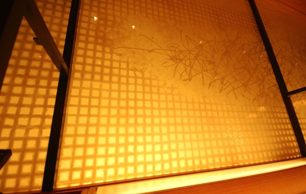 「和紙ラミネートガラス」には、 和紙を特殊な接着方法で挟み込んが2層タイプと、ガラス背面に和紙を施す1層タイプの2種類があり、今回は1層タイプの施工例をご紹介したいと思います。