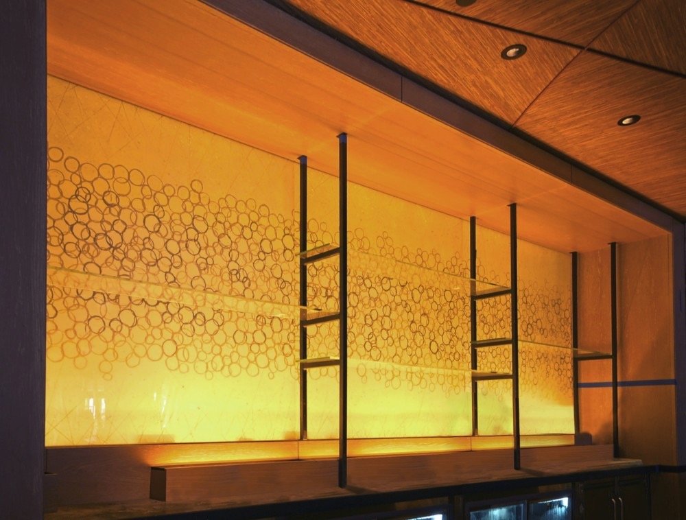 その美しい透明感から、LED照明などと絡めカウンターやテーブルトップ、天井やウォール、スタンドランプやシーリングライトなど採光効果に数多く使われ、店舗やパブリックスペースなど光の演出を大切に考える際、空間装飾に最適な建材です。