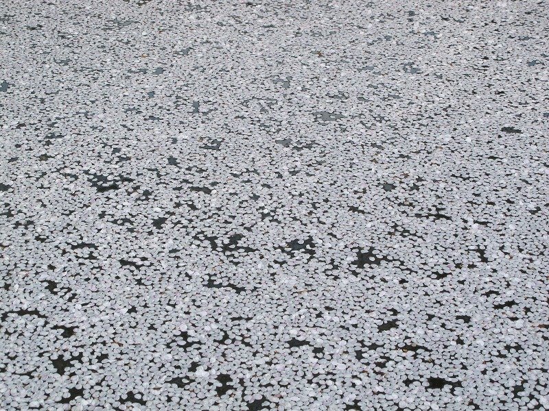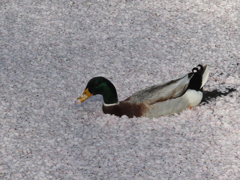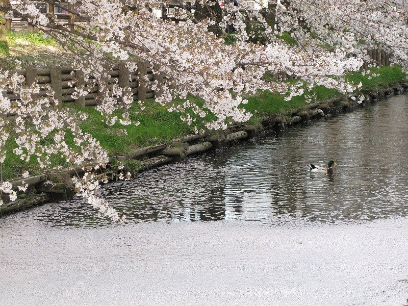 氷川神社の裏手にある新河岸川を見ると、散った桜の花びらが川に落ちて集まり流れる「花筏」を見ることができました。