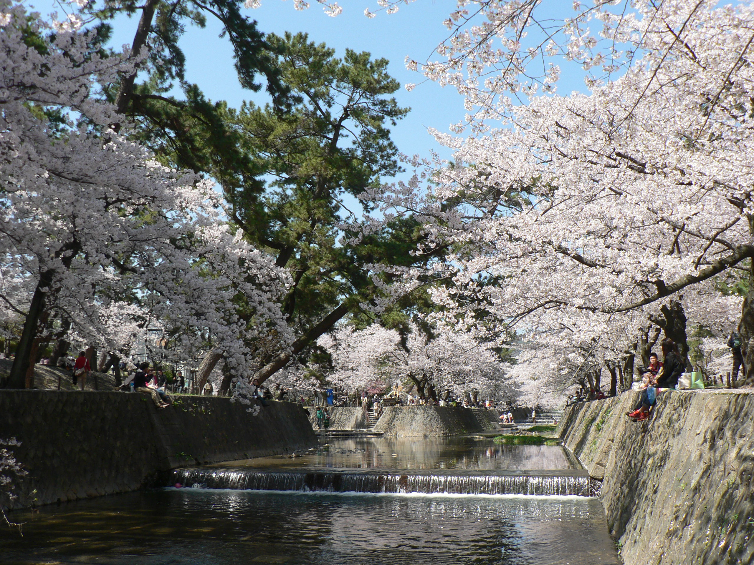 両岸からせり出すように桜が咲いています。