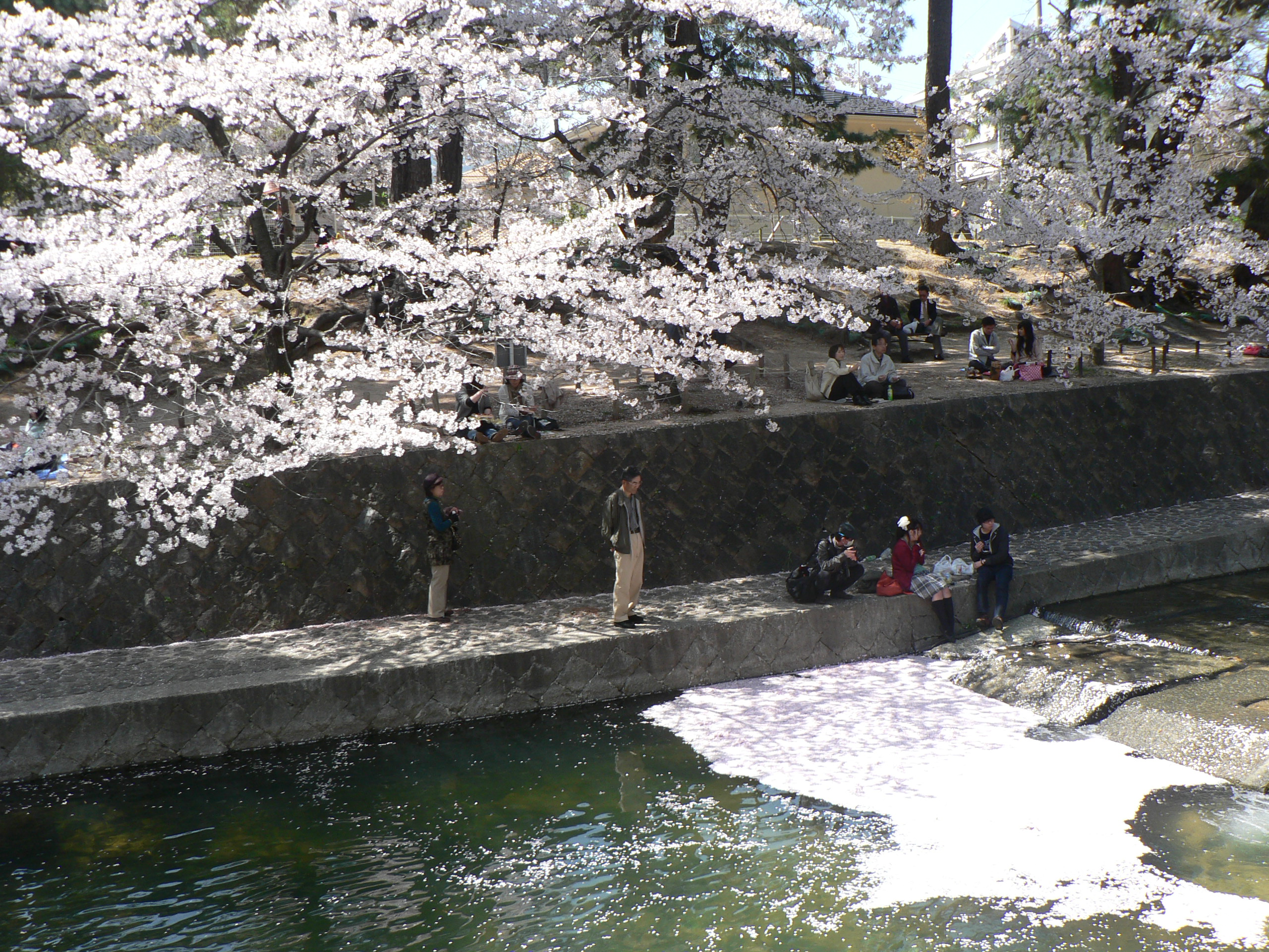 前日の雨で、桜の花びらが、水面に浮いていました。