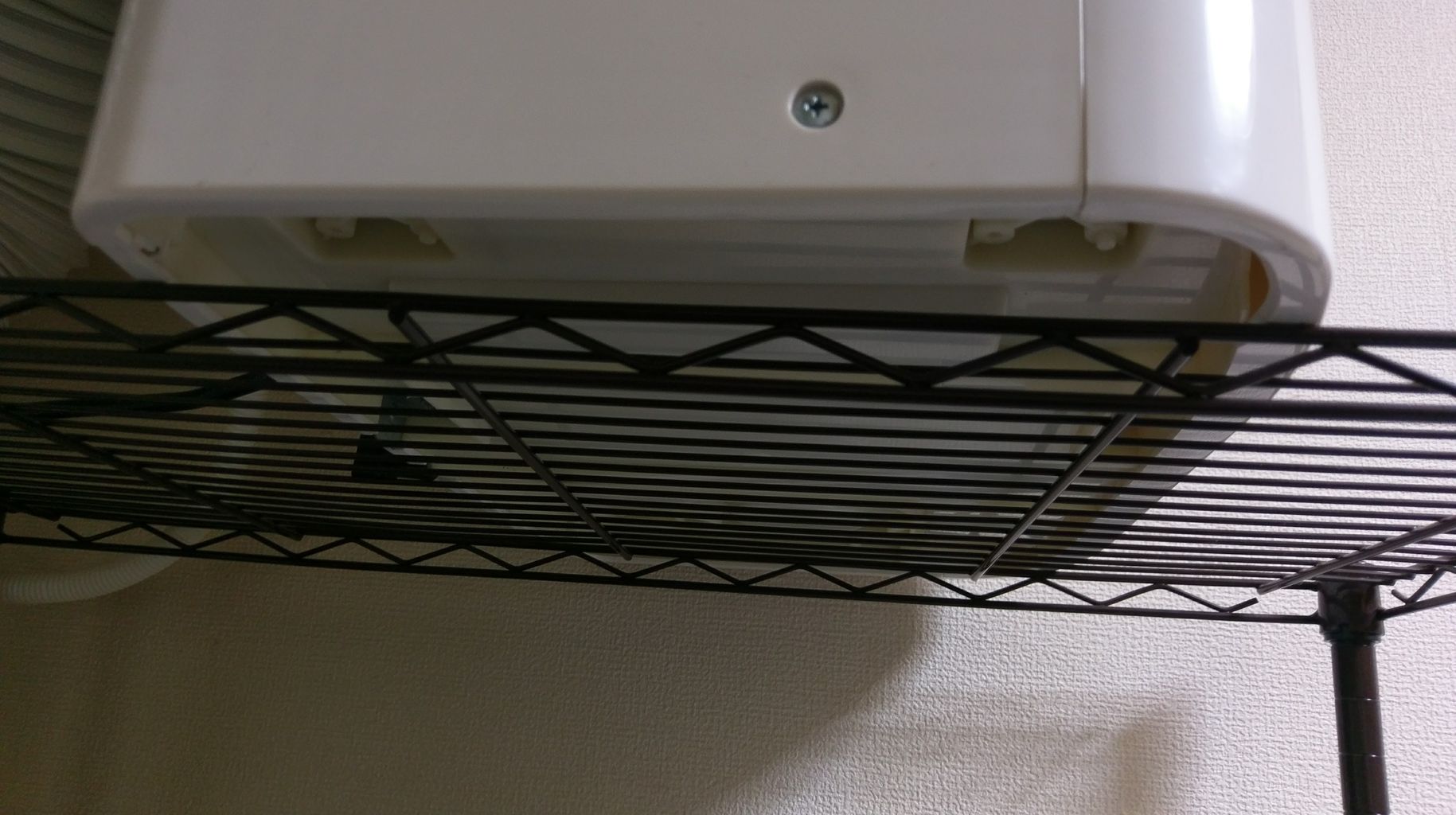 エアコンの裏側、なぜ棚の上に置くかというと、排水のためです。この高さだと外に排水されます。