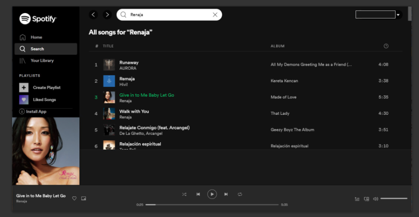 Spotifyでもこんな風に検索表示されるのとそのまま曲が再生されます。