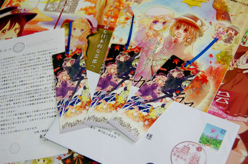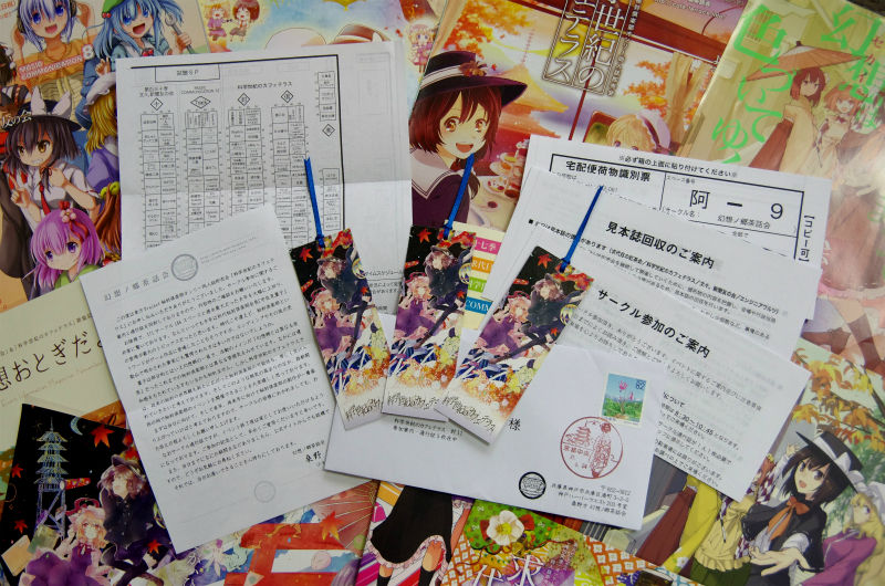 ちなみに。サークル入場証は、このような書類がセットになって送られてきます。「サークル入場証(1スペースなら2枚、500円の追加料金でプラス1枚)」、「サークル参加案内」「見本誌回収の案内」「宅配便荷物識別票」「サークル配置図」、そして幻想ノ郷茶話会の代表である久樹輝幸さんからの手紙が添えられています。