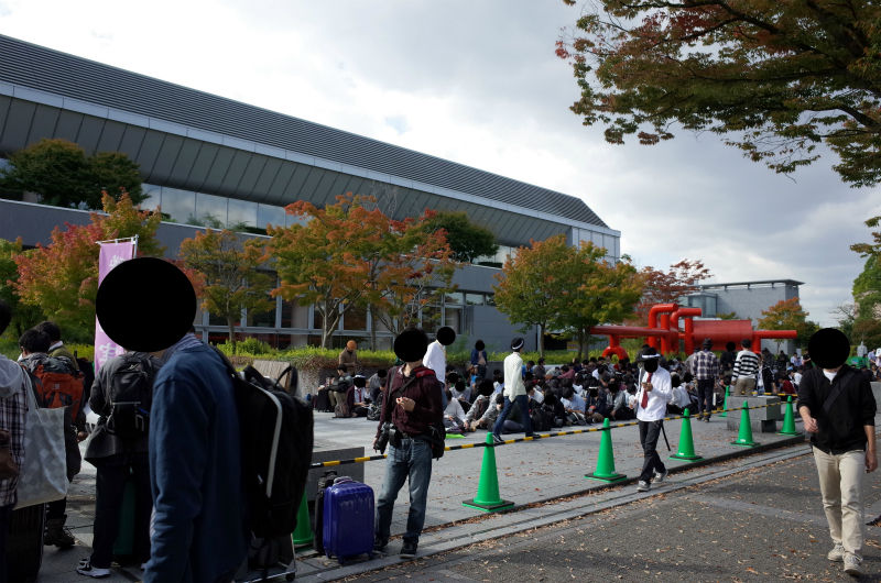 午前9時30分、京都市勧業館みやこめっせへ到着です。既にみやこめっせ前には待機列が形成されており、大勢の参加者の方が並んでおられます。噂では、午前8時頃から列が出来始め。明らかに去年より多い人手があったそうです……。そして、ぱっと見ただけで、5~6人は蓮子帽を被った方々が確認できますね(笑)