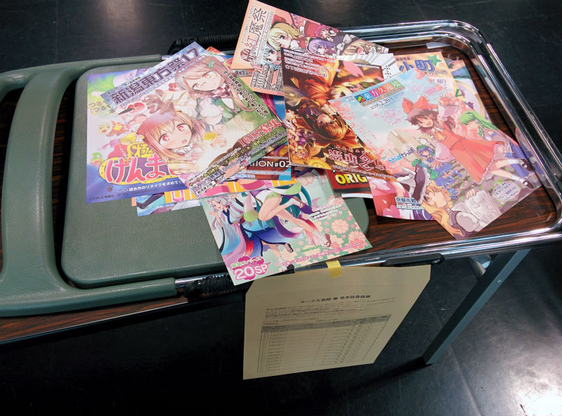 まずは布を敷いて、段ボールから本を取り出しては並べ、取り出しては並べ。無料配布の写真も並べに並べ。そして最後にサークルのネームプレートと、値札のプレートを添えれば……完成です!