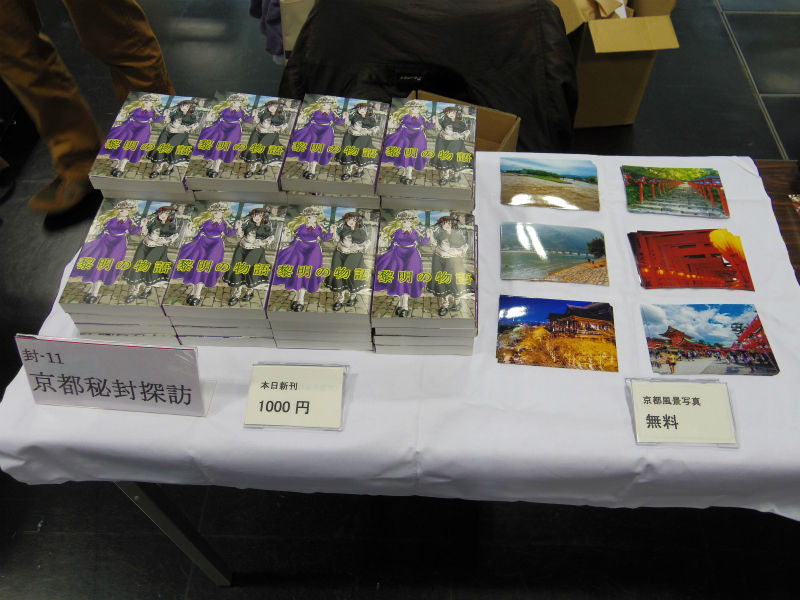午前10時10分、無事に設営が終わりました。やれやれ…….。これが今回の頒布物になります。新刊の小説が一種類、京都の風景写真が6種類ですね。風景写真は「台風で増水した鴨川デルタ」「雪の積もった嵐山渡月橋」「例祭を控え、手摺の撤去された貴船神社」「ライトアップされた清水寺」「本宮祭を迎えて、無数の提灯で飾られた伏見稲荷」となります。いずれも、年に数日。あるいは10年に一度見られるかどうか……といった貴重な風景ばかりになります。