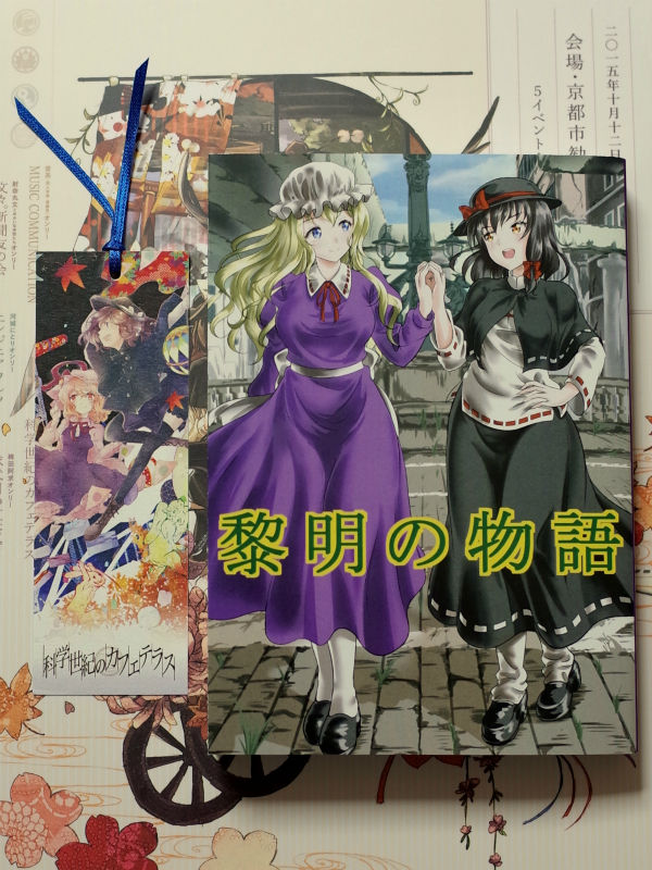 そして気を取り直して、自分のサークルです。今回の京都秘封探訪のメインの頒布物である新刊小説「黎明の物語」。文庫判276ページで頒布価格は1000円。表紙と挿絵は、サークル「春日野企画」の春日野トバリ先生(旧名・gear)です。