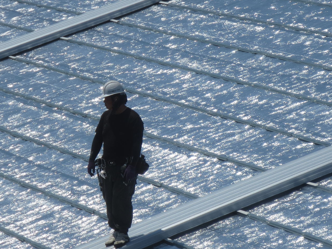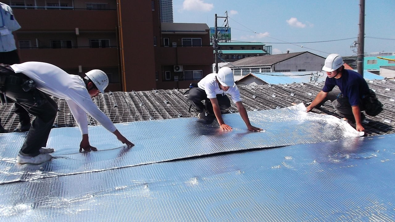 スレート屋根に遮熱材を敷く作業
