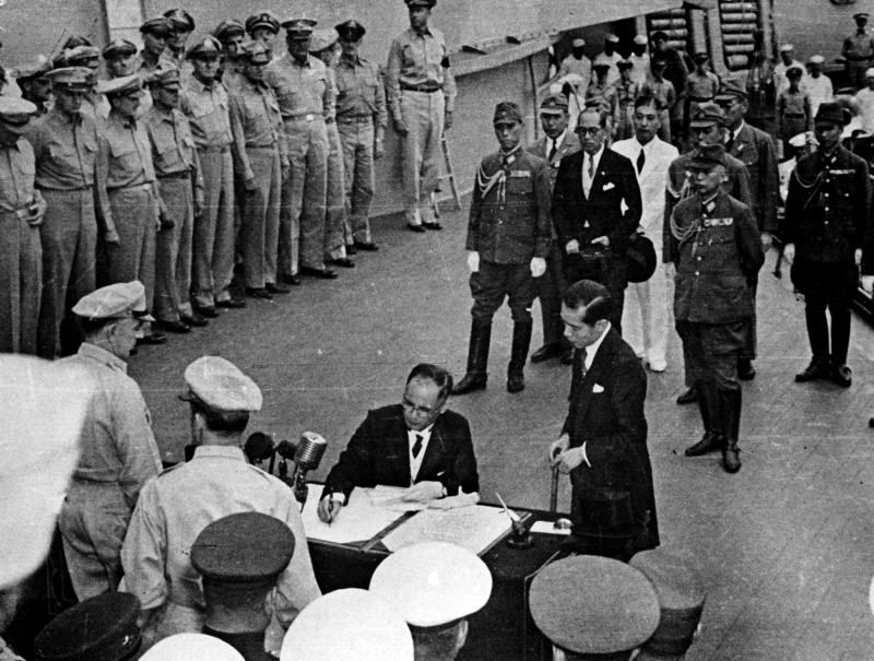 Photo:ミズーリ艦上で降伏文書に署名する重光葵外務大臣(昭和20年9月2日)
