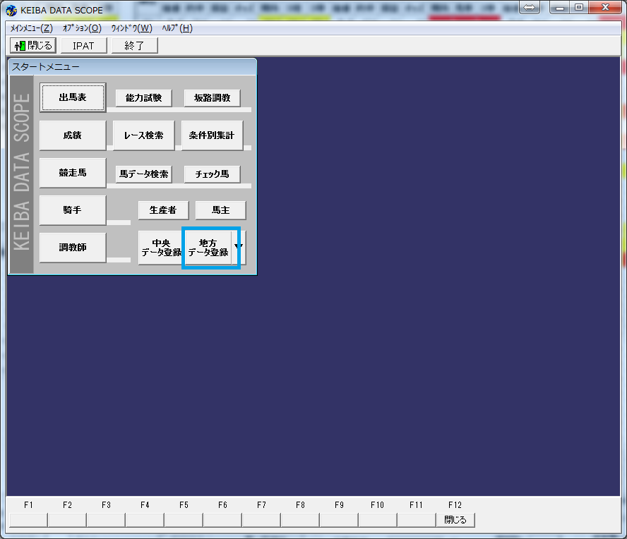 地方競馬のデータを取得するには「地方データ登録」を押します。JRA-VANに加入している人は「中央データ登録」で中央競馬のデータを取得することも出来ます。
