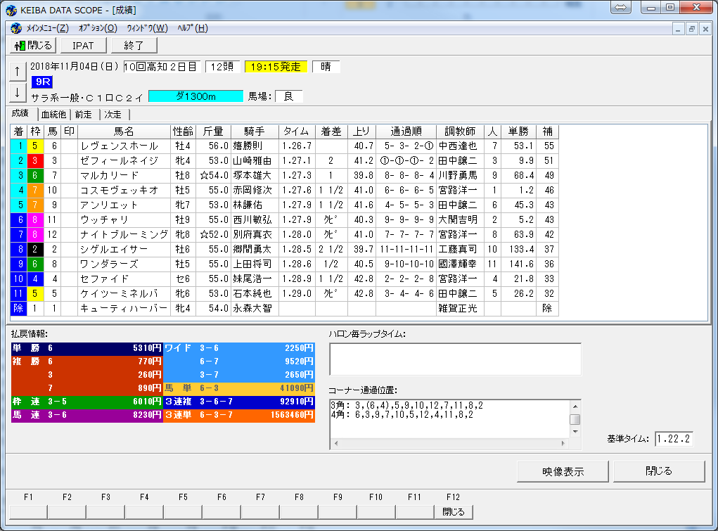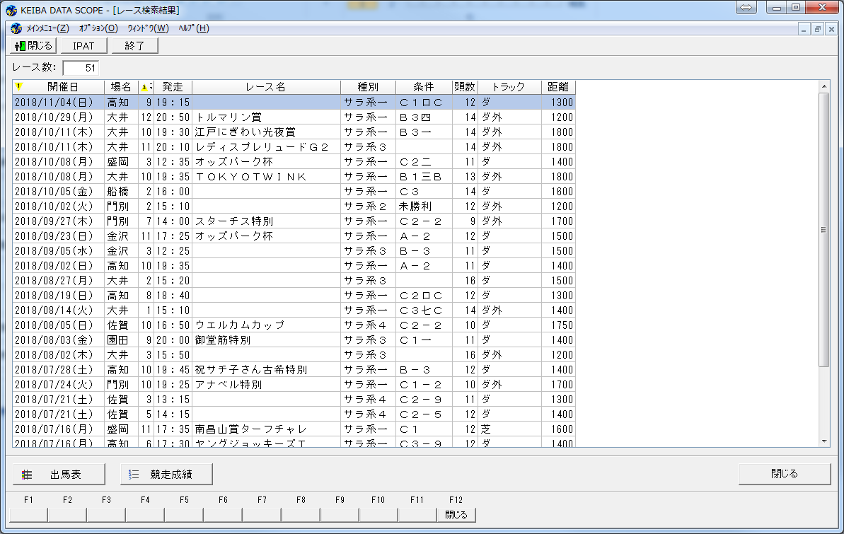 3連単100万円以上のレースは51レースもありました。レースをダブルクリックすると成績画面を表示します。1番人気の赤岡騎手が4着になったので100万馬券になったようです。