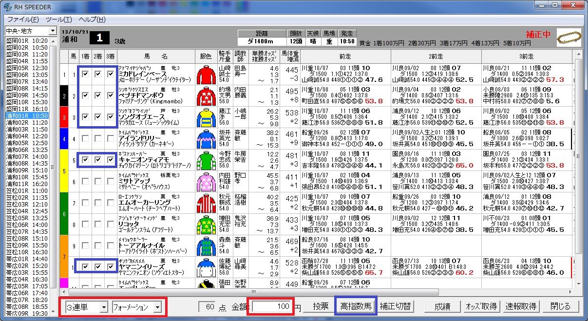 単純に赤くなっているスピード指数(青色の最高値含む)の馬だけで馬券を買うことが効果的です。購入馬券種類、買い方を選択した後で「高指数選択」押して下さい。
