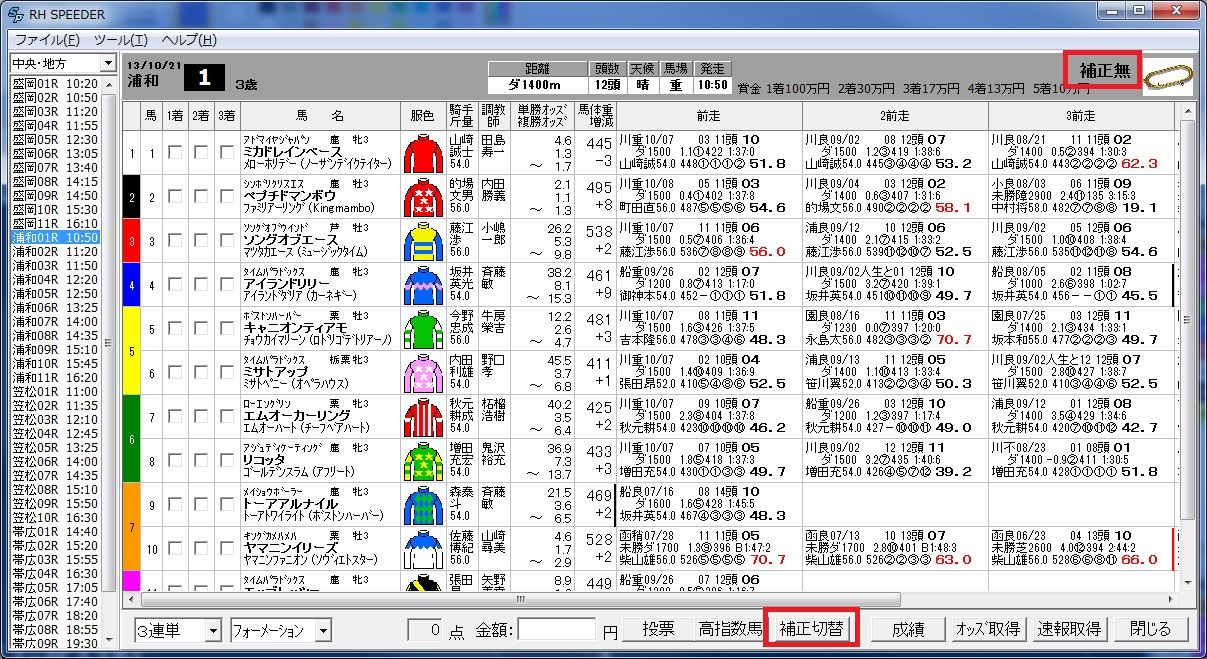 「補正切替」とは、表示しているスピード指数にレース毎補正を加味して表示するか、しないかを切り替える機能です。「補正切替」を行うと画面右上の「補正中」の表示とともにスピード指数が変わります。