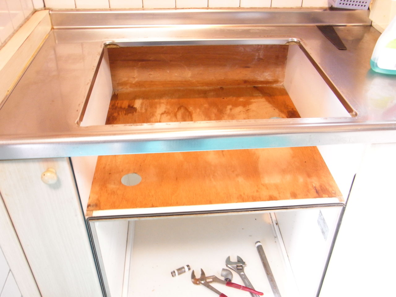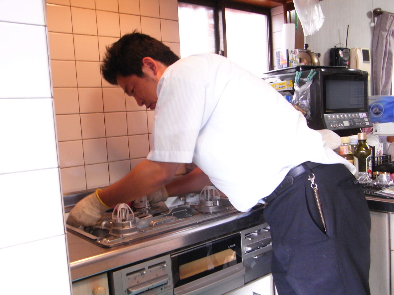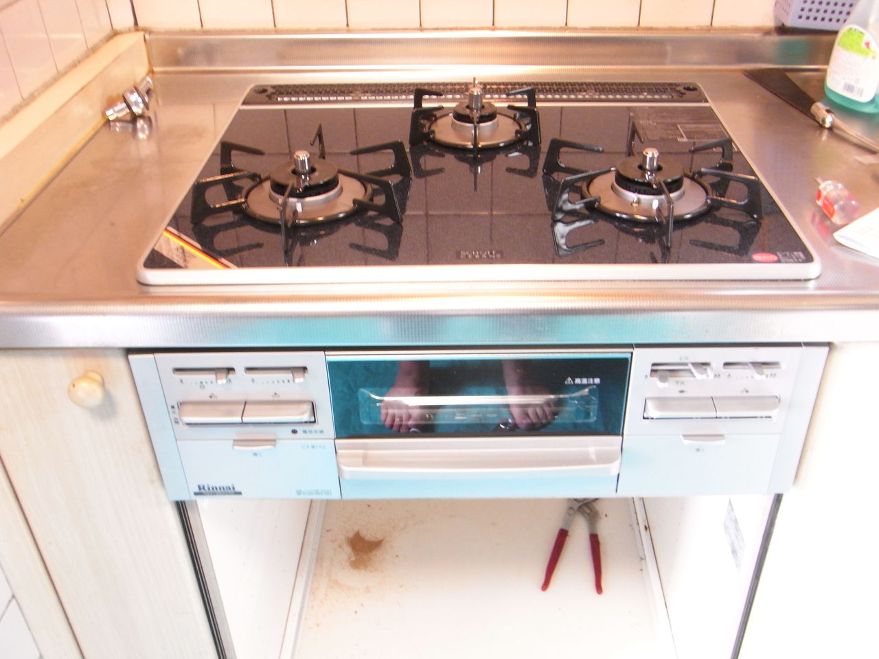 稲葉君が来るまでの間に古いコンロを外します。久しぶりの作業に、なんでかんで言ってもワタシって「やっぱりガス屋なんだろなぁ〜?」って思いました。