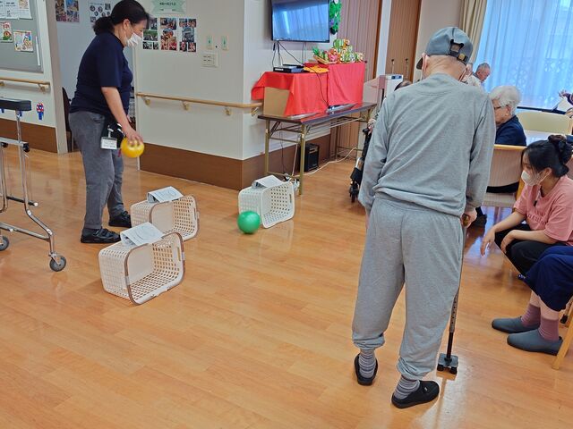 手で投げる入居者様に「足、足!」と声がかかったり