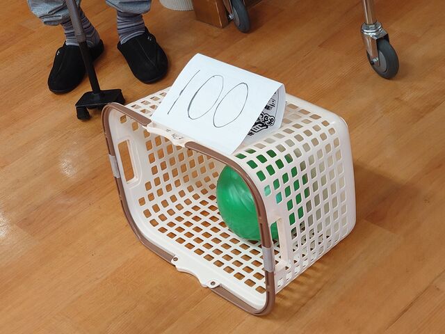 今日は、椅子に座ってボールをキック。ゴールをめざしましょう。チャンスは2回。
