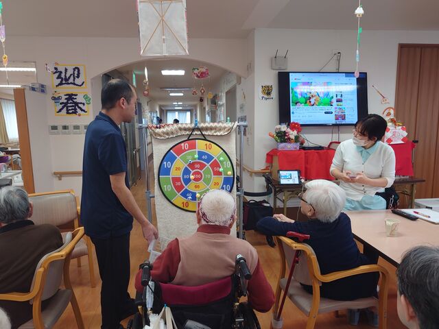 2026年01月26日 高得点を狙って!🎯 食堂が盛り上がっているご様子。的あてゲームの真っ最中のようです。的をねらって慎重にボールを投げる入居者様。投球も様になっています。ポンポンと投げ続ける入居者様も。しかも、高い得点をゲットし続け、応援の入居者様もスタッフも「すごい!命中!」と大盛り上がり。高得点を狙い順番に楽しむ入居者様でした。 🫛 事務員 〇尾 カテゴリなしの他の記事 ボールリレー令和8年誕生日会