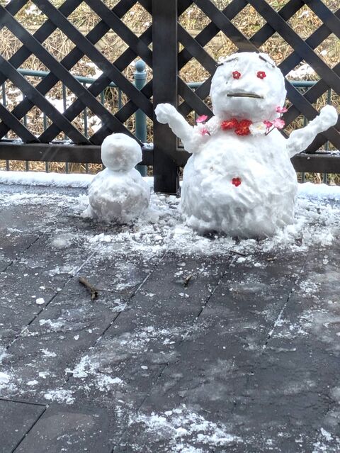 先日、テラスにうっすらと雪が積もり、外は一面の銀世界となりました。せっかくの雪景色を楽しもうと、スタッフで雪だるま作りに挑戦しました