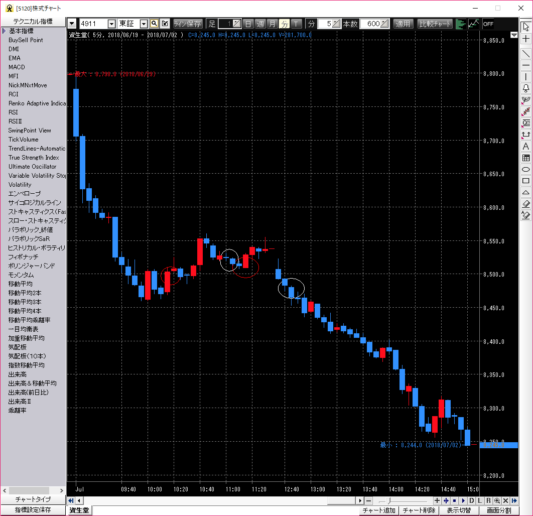 赤丸イン、白丸アウトを2回転。二度目のインまでは良かったが、後場の急落でマイ転。そこでドテンで空売りも考えたが、実行できてないのでダメダメ。