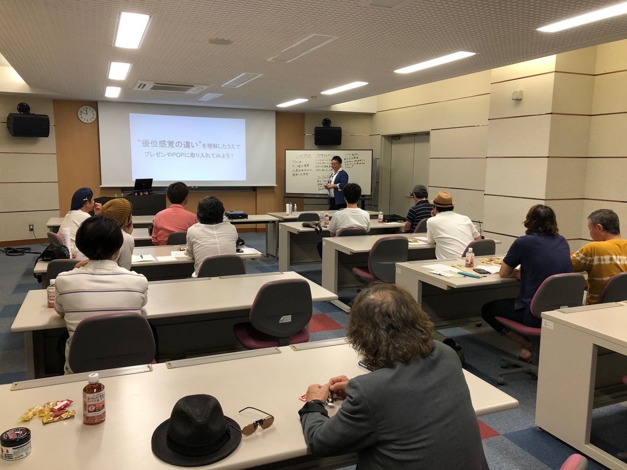 加賀支部講習会「知っていただこう自店の魅力!~そうだったのか!伝え方の秘訣は◯◯にあった!~」は7月29日(月)、沢村篤史県講師を迎えて小松市生涯学習センター(第一公民館)で開催され、15人が受講しました。