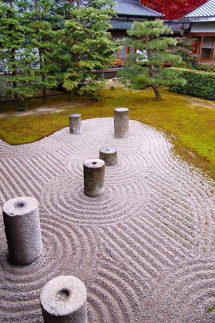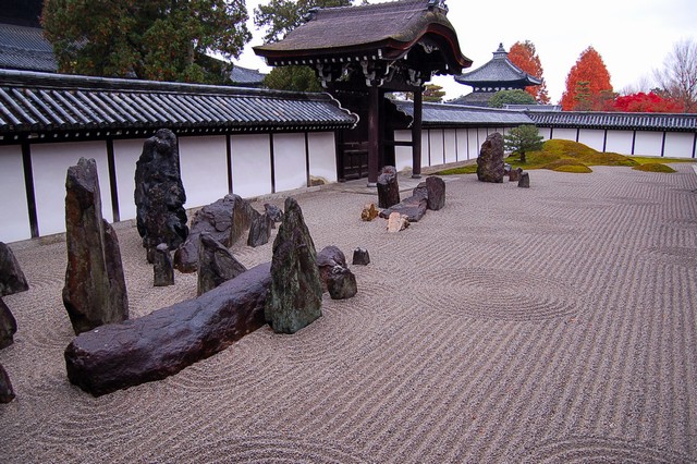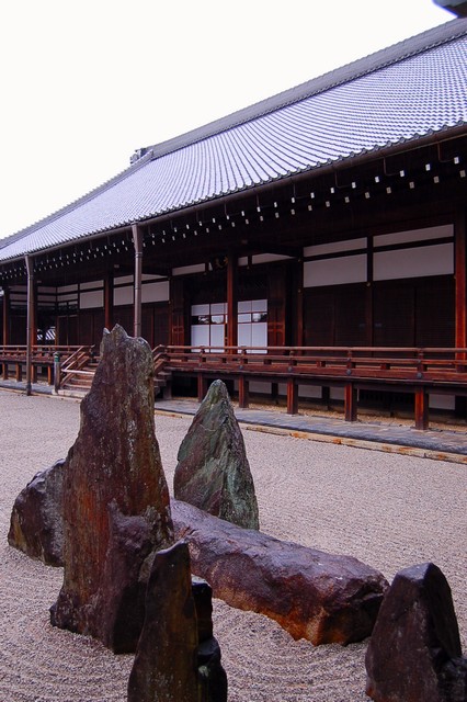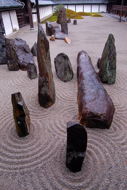 方丈前庭(南庭)は白砂の上に峻険な岩を配置している。庫裡で靴を脱いで、廊下を歩いて視界が開けると、まずこの険しい岩群が目に飛び込んでくる。ヴィジュアル的にもかなりインパクトがある。激しい。