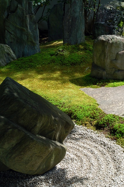 間近で見ると、豪胆な石組が庭を所狭しと埋めており、息が詰まりそうにも感じるのだが……書院の中から眺めると、あら不思議、意外にもすっきりとしていて、額縁の中で石の立ち姿が美しくも感じる。