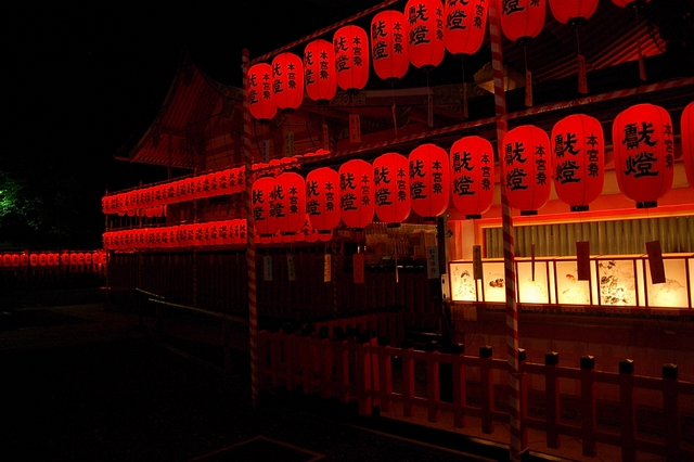 宵宮祭の万灯神事では、境内一帯の献納提灯に明かりが灯る。夜の空から眺めたら、社殿全体が闇の中に赤々と浮かび上がるように見えるのだろうな…。