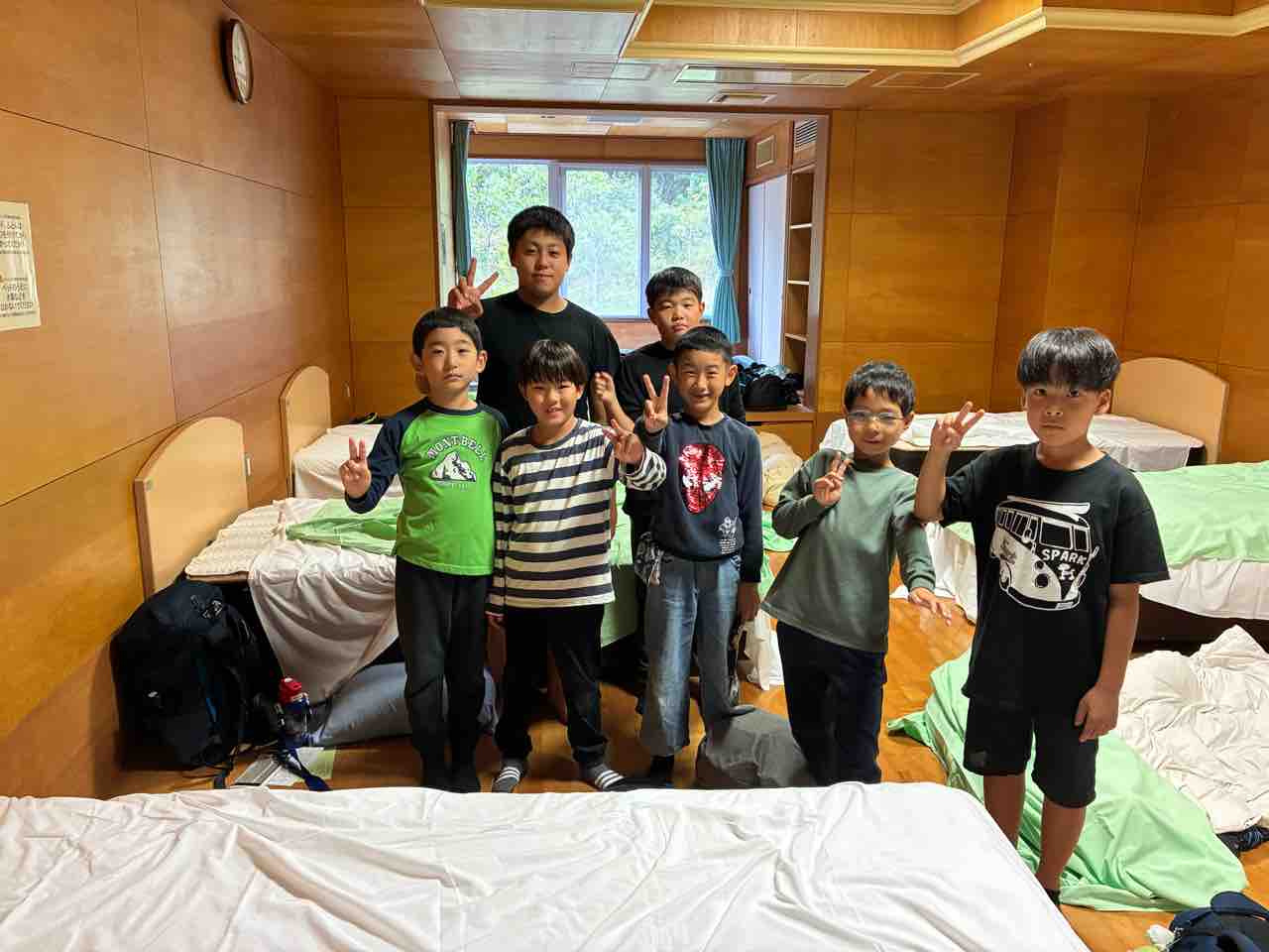 集合した子どもたちは、まず準備体操と基本稽古で汗を流します。年に1度の貴重な合宿なので、普段の稽古よりも、さらに深く説明をまじえ、武道の所作の意味や心のあり方などを伝え、日常の行動が、意味のない反復動作にならない様に意識することを学びました。