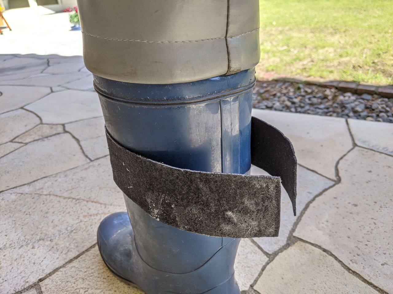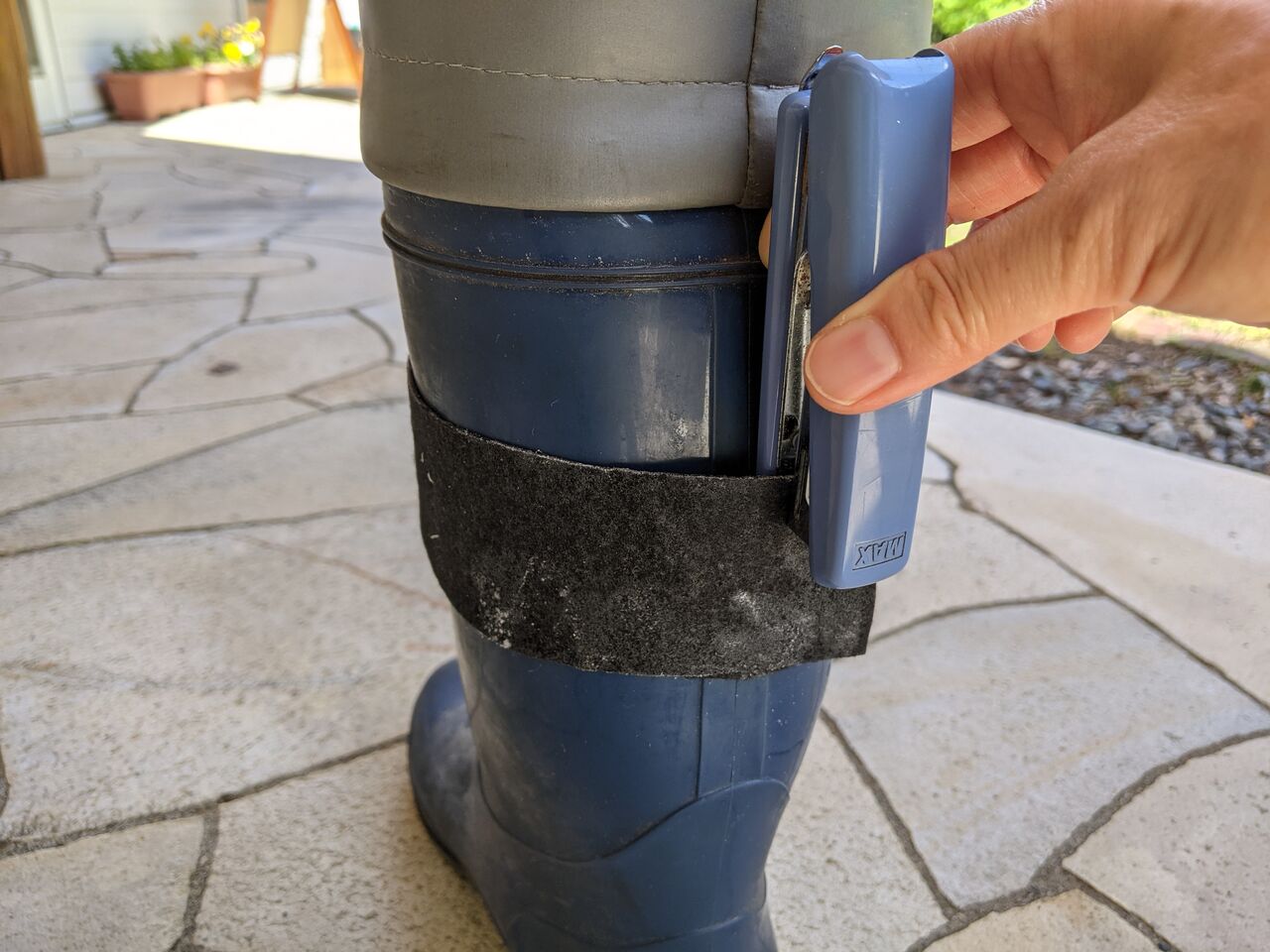 布のガムテープをホチキスで止め、長靴に貼り付けます。