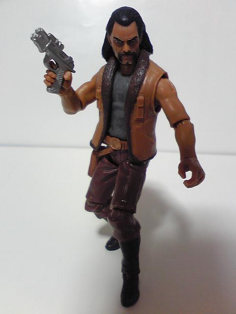 可動は…関節は一通り動くんですがね。見ての通り服が邪魔で脚はほとんど動かせんのですよ。まあこういうキャラなので余り問題じゃないですが。適当にブラスター持たせてみましたがこいつには付属してません。武器がないのです。