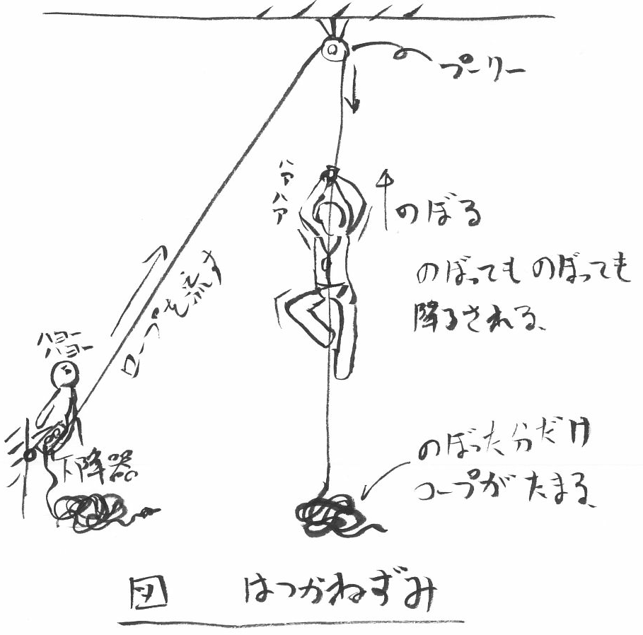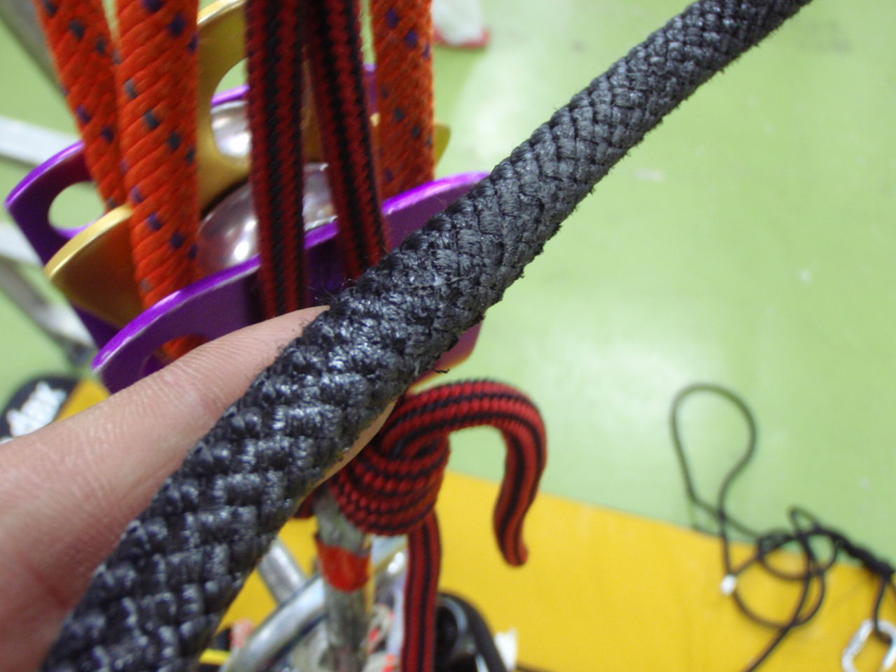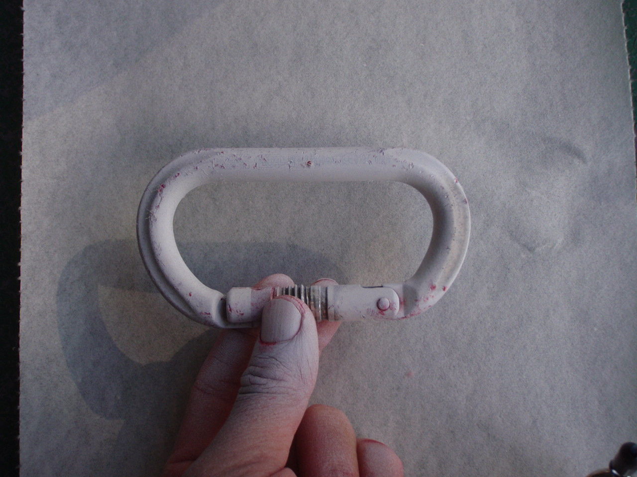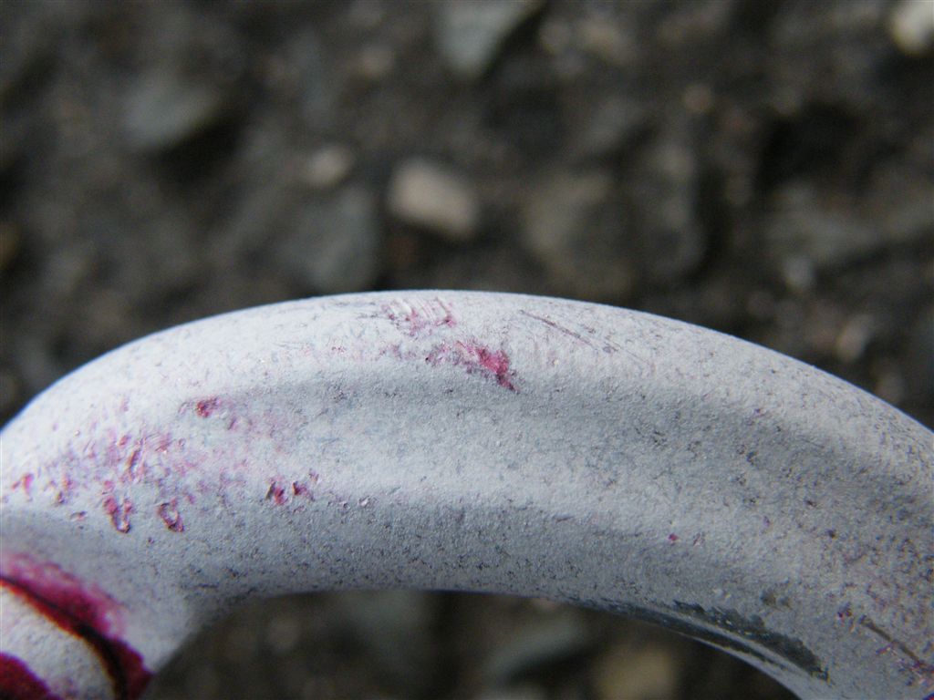 壁面に設置されたアンカーにロープを固定する際、D型ではロープのノットが壁面と擦れてしまう。一方、オーバル型では壁面とノットが離れることによってノットと壁面の擦れが回避・軽減できる。