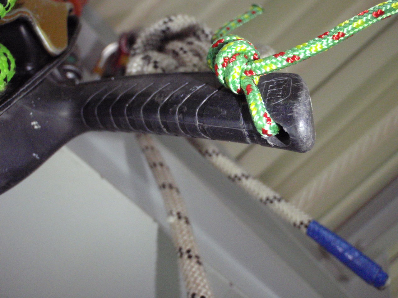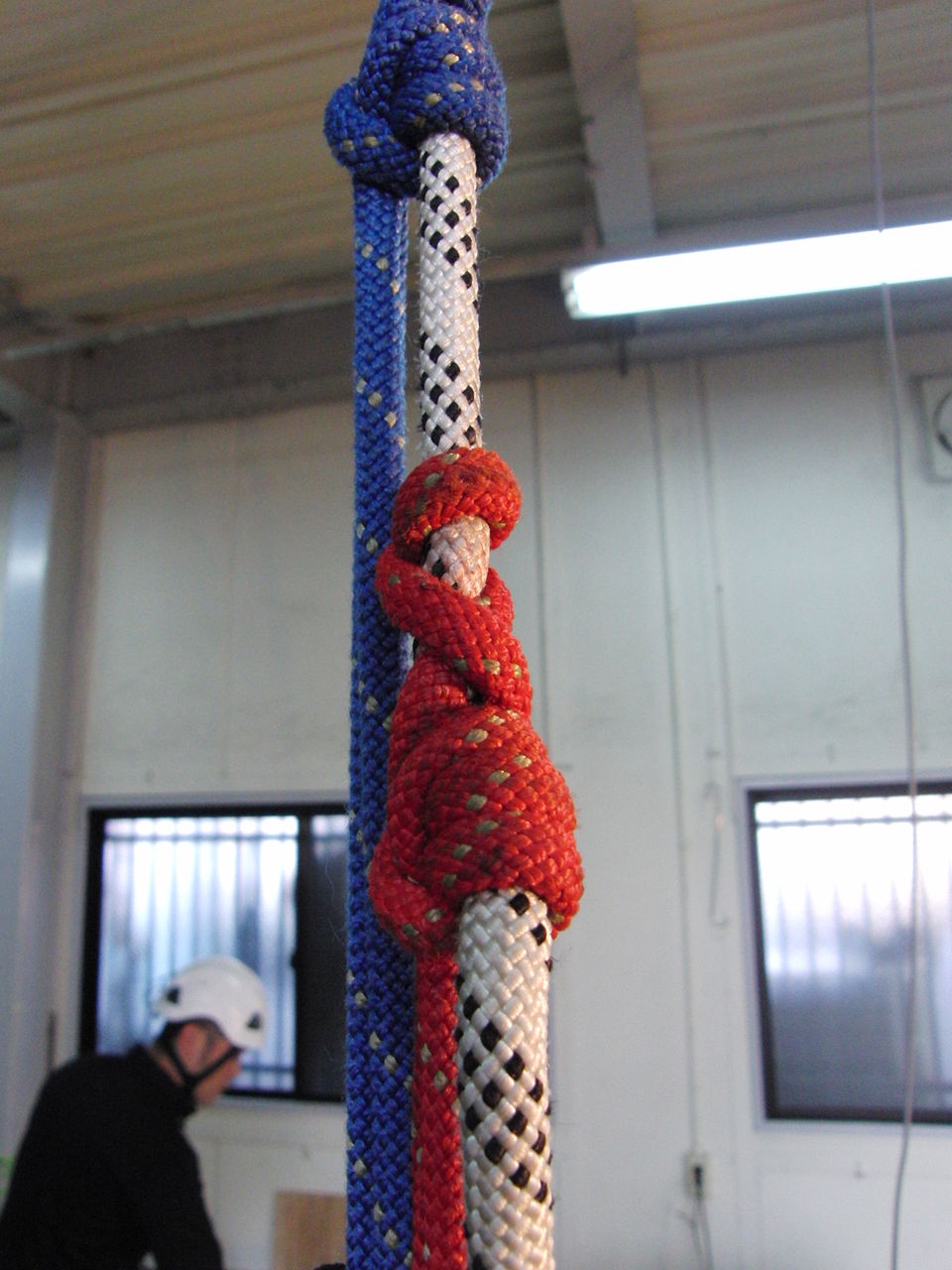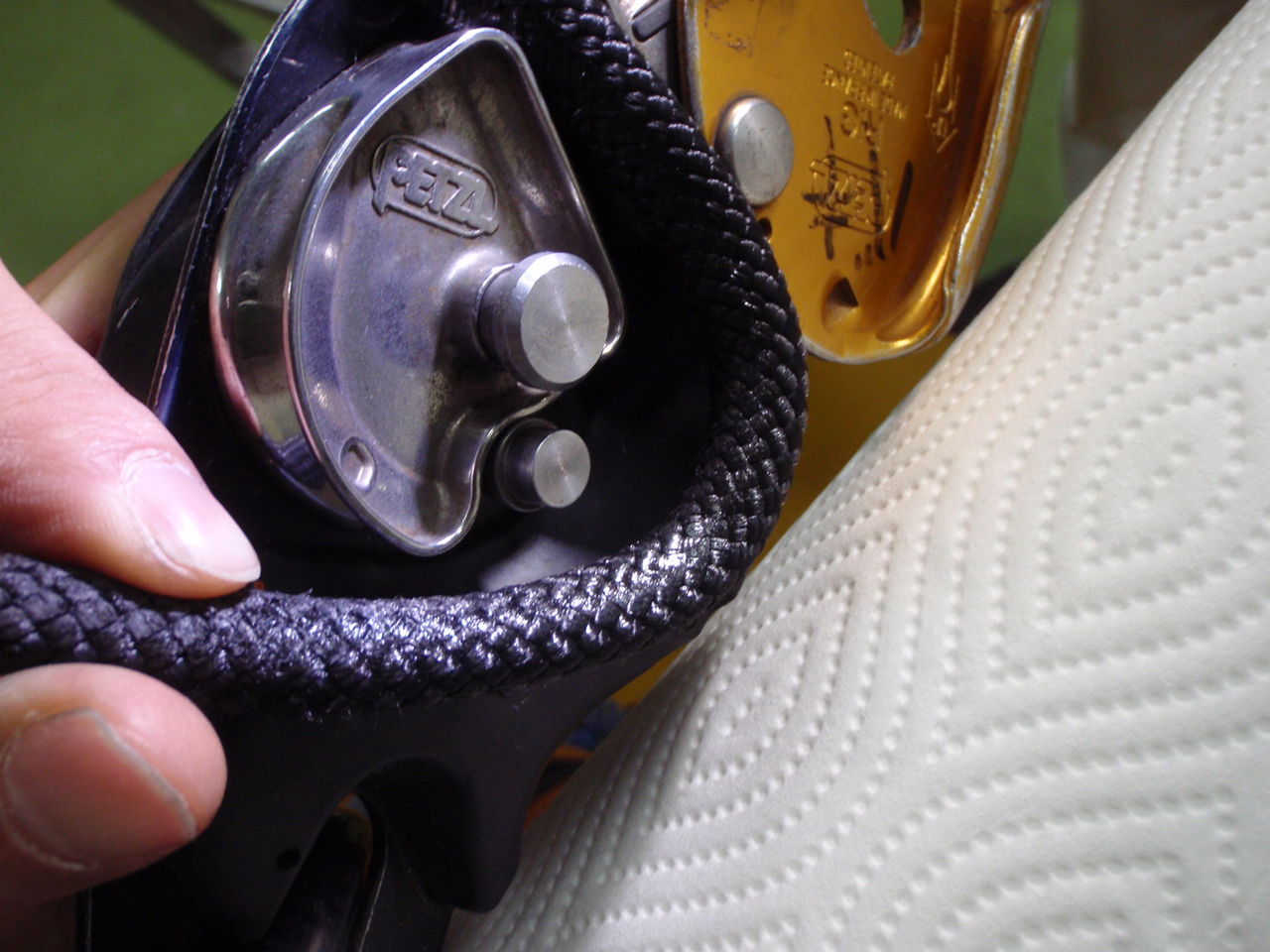 壁面に設置されたアンカーにロープを固定する際、D型ではロープのノットが壁面と擦れてしまう。一方、オーバル型では壁面とノットが離れることによってノットと壁面の擦れが回避・軽減できる。