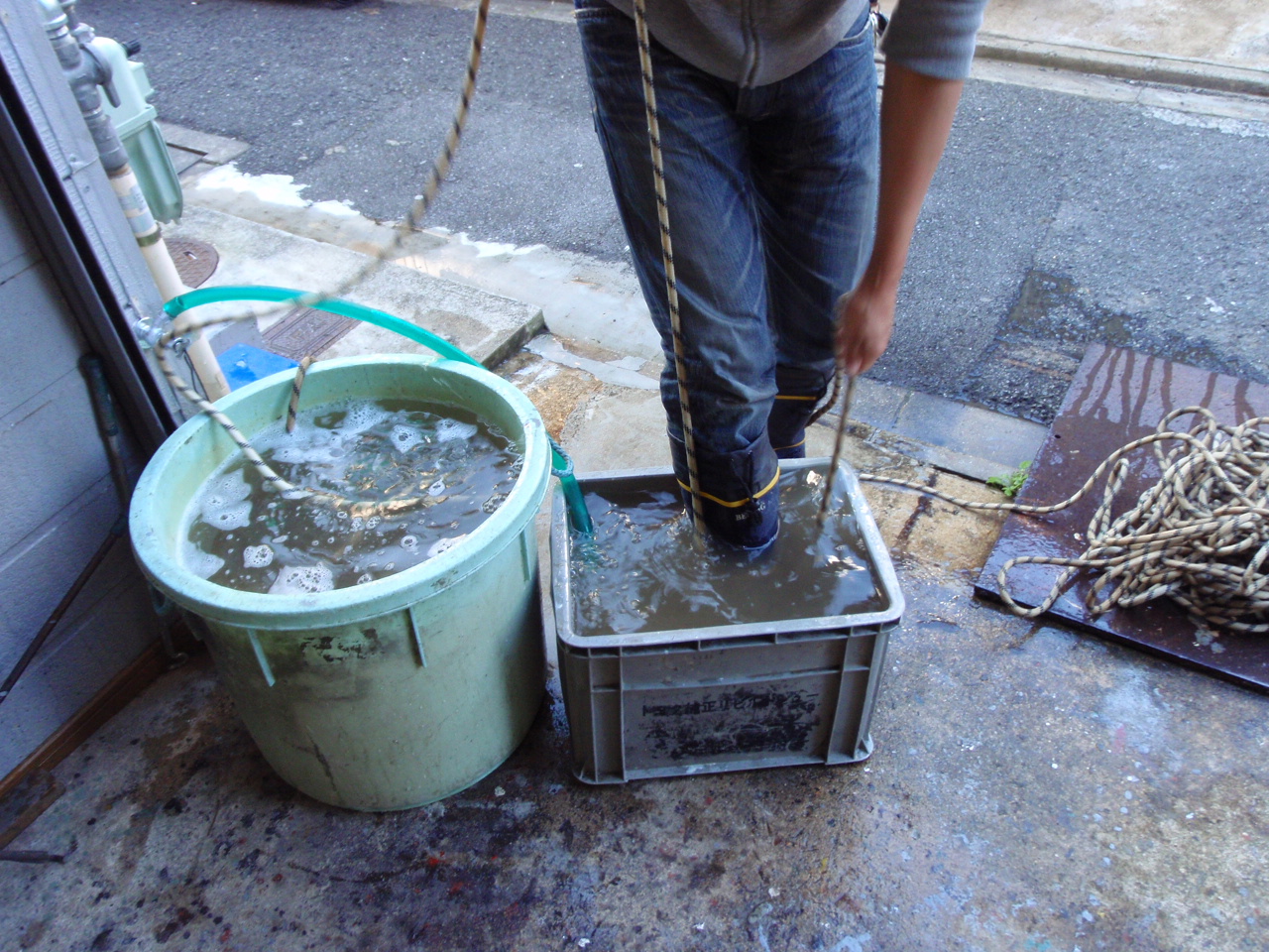 1.水を張った大きなタライに、ほどいたロープを末端から手繰っては順次入れていく。
