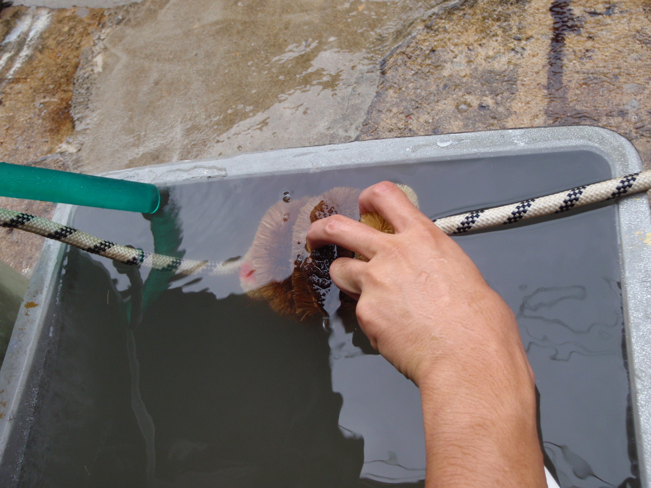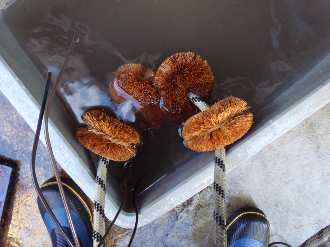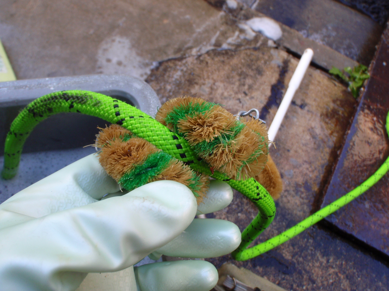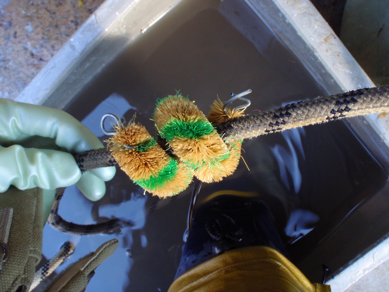 汚れのひどい箇所はロープに通したタワシを手作業で往復させてゴシゴシと洗います。
