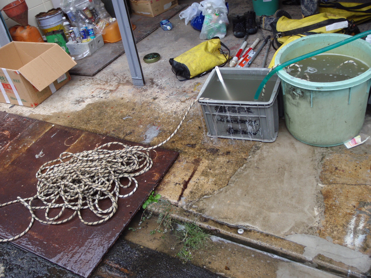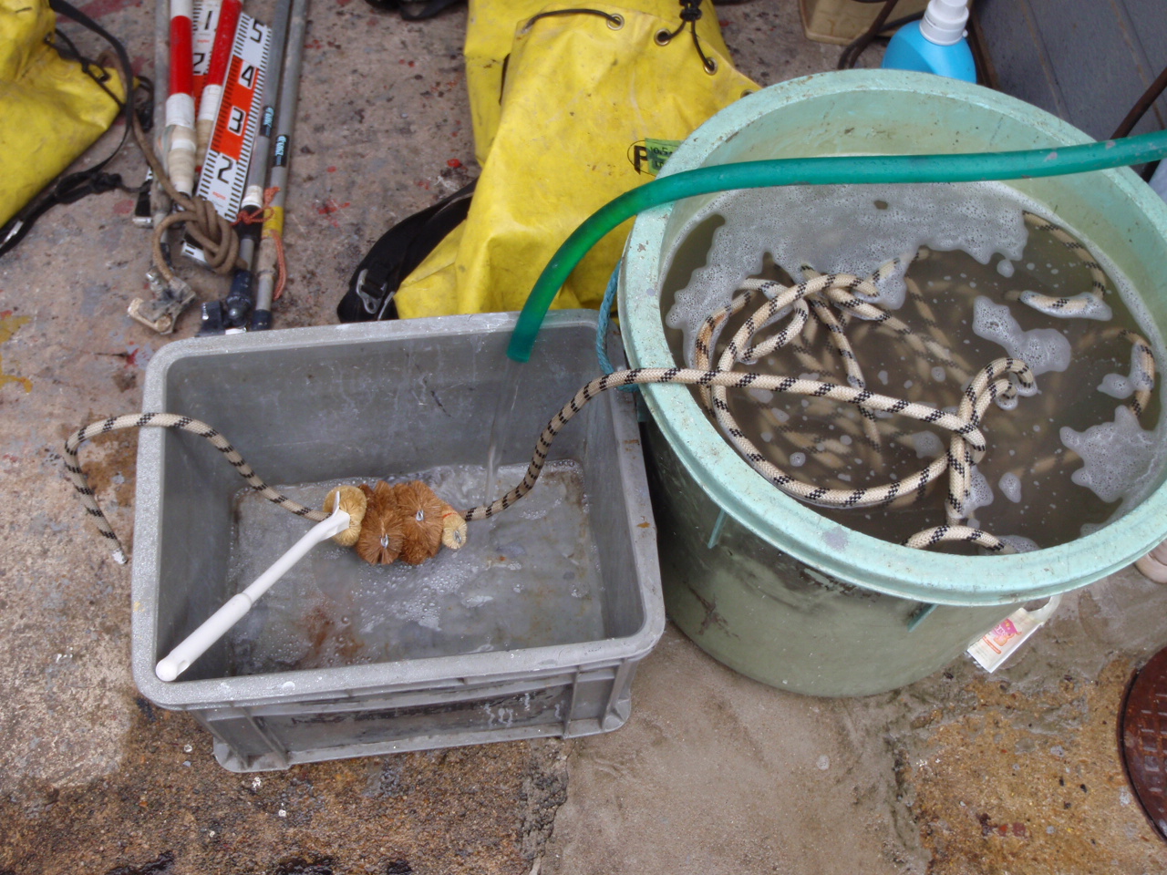 ロープ洗いに掛かる時間は、汚れの程度にもよりますが、一人でやる場合、100mにつき30分程度かなと思います。