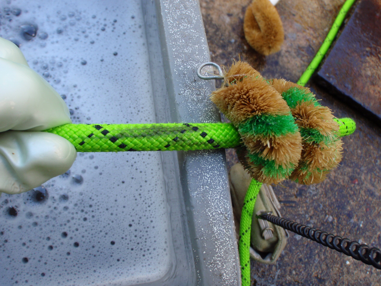 僕は天然パームヤシの亀の子たわしを利用してロープを洗ってます。
