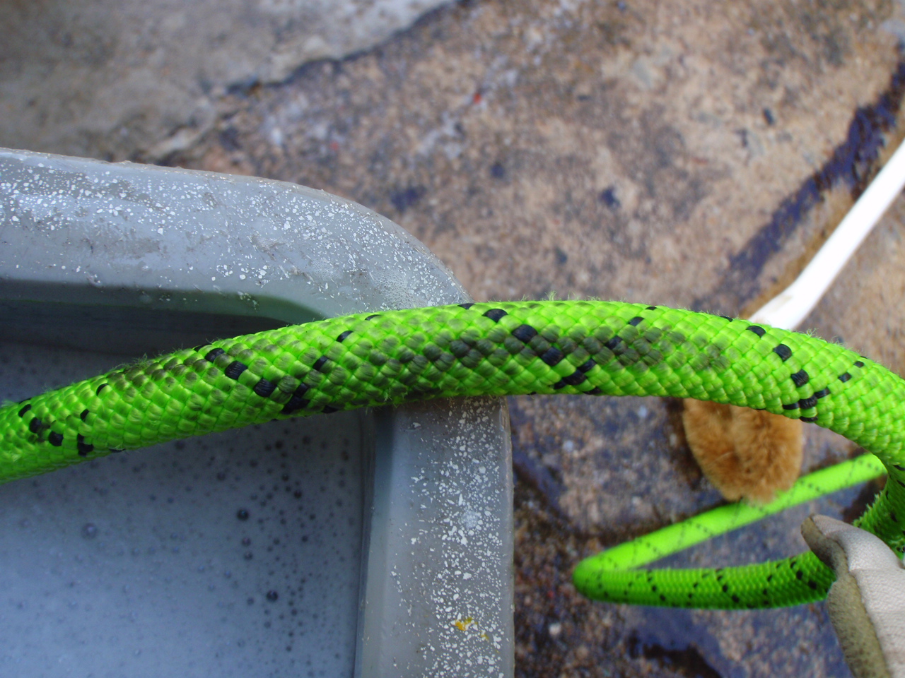 この作業で、ロープの外皮についた汚れをやわらかく落ちやすくし、内芯に浸透した汚れを染み出しやすくします。