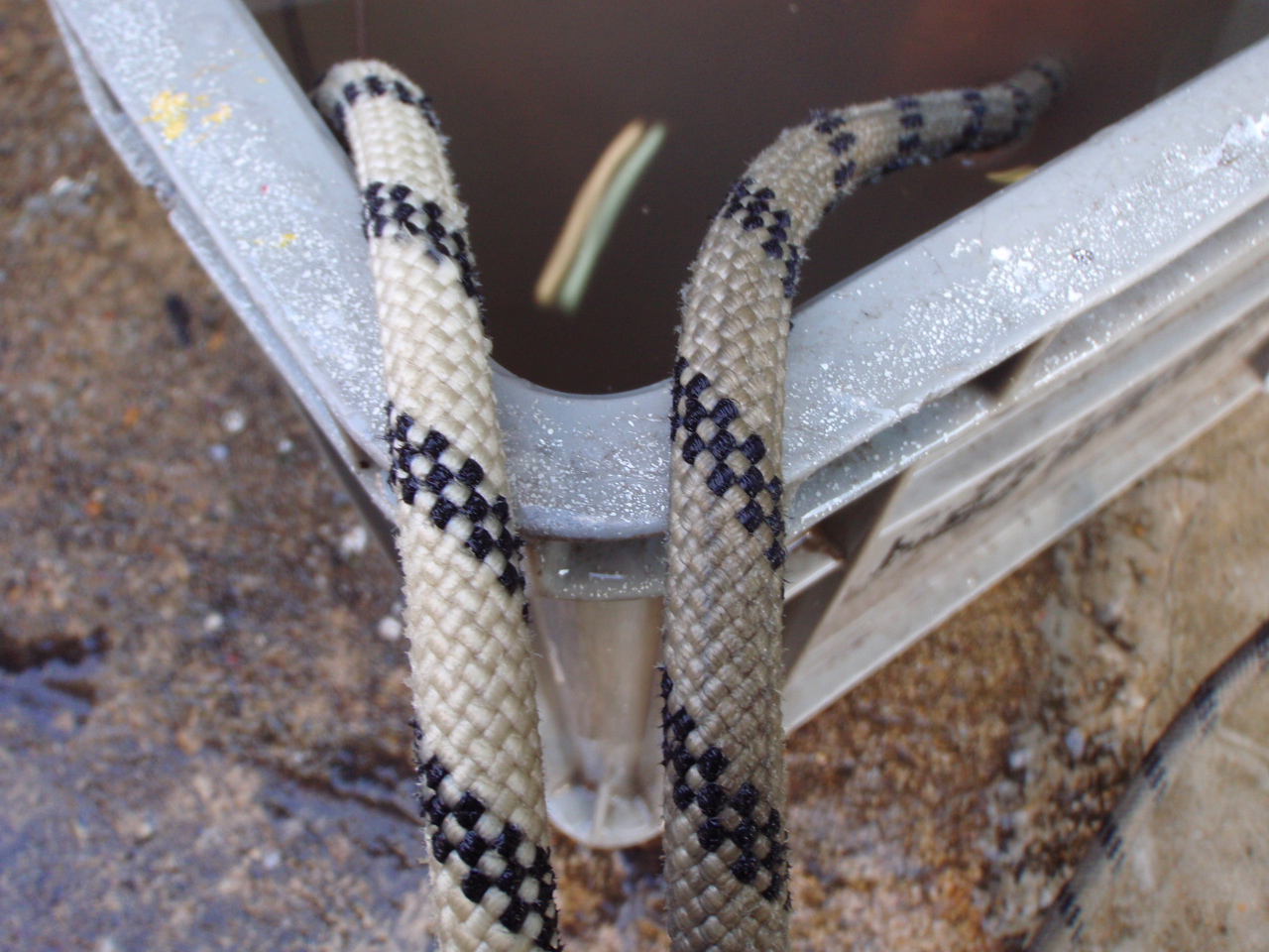 複数本のロープをいっぺんに洗う場合、2本目以降は、始まりの末端もエイトノットにしてタライの外に出しておくようにします。