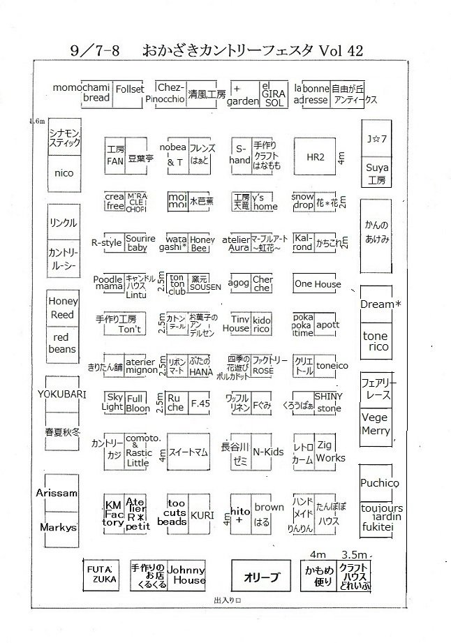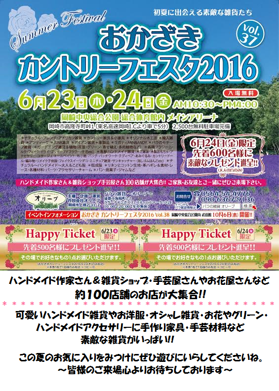 今回も雑貨ショップさん&ハンドメイド作家さんが100店舗大集結!!!ナチュラル&フレンチ雑貨やお洒落雑貨、グリーンやお花、リース、ガーデン雑貨に可愛いハンドメイド雑貨に大人&こども服やアクセサリー、本格的な家具からオシャレな木工雑貨、JUNK雑貨etcまだまだ他にも多種多様なアイテムが勢揃いします!生地やレース・チャームなど手芸素材も豊富です。ぜひ、9/7(木)・8(金)は、おかざきカントリーフェスタへ遊びにいらしてくださいね。皆様のお越しを心よりお待ちしております。*おいしいパンや焼き菓子、クッキーなどの販売もありますよこちらも、是非お楽しみに.............!! |