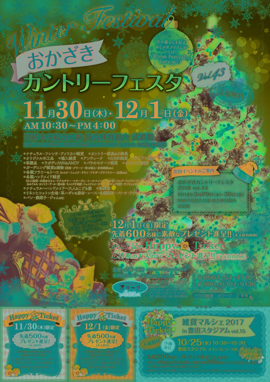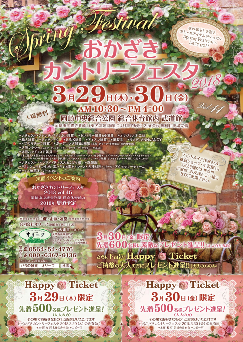 おかざきカントリーフェスタ2018VOL.44 無事終了いたしました。 今回も大勢の皆様にお越しいただき、 心より感謝申し上げます。 誠にありがとうございました。 次回もぜひ遊びにいらしてくださいね。 ~皆様のお越しを心よりお待ちしております~ |