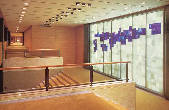 この回廊の壁には,四季に応じた絵画が掛けられています。新年・天皇誕生日と国賓来日時には,奥村土牛作「富士」が掛けられ,内藤四郎作の「流水文銀壺」か帖佐美行作の「和讃想」が飾られます。