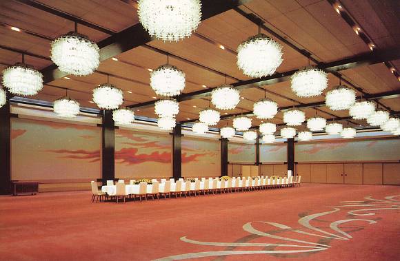 豊明殿は,広さ915平方メートル(約280坪)で,宮殿内では最も広い部屋です。名称は昔の宮中における饗宴の一つであった「豊明節会(とよのあかりのせちえ)」にちなんだものとされています。部屋の壁画には,中村岳陵作の原画による綴れ織りの「豊幡雲」が用いられ,また,床には,杉山寧作の「草」を図案化したカーペットが敷かれています。