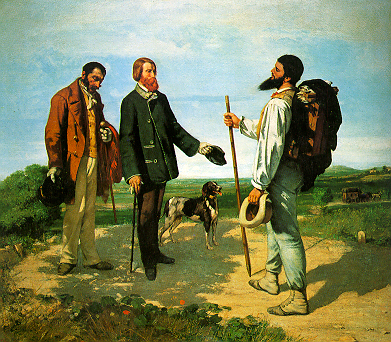 まさに《紳士が帽子を取る》という場面を描いた、クールベの作品「クールベさん、こんにちは」を例に、みてみよう。