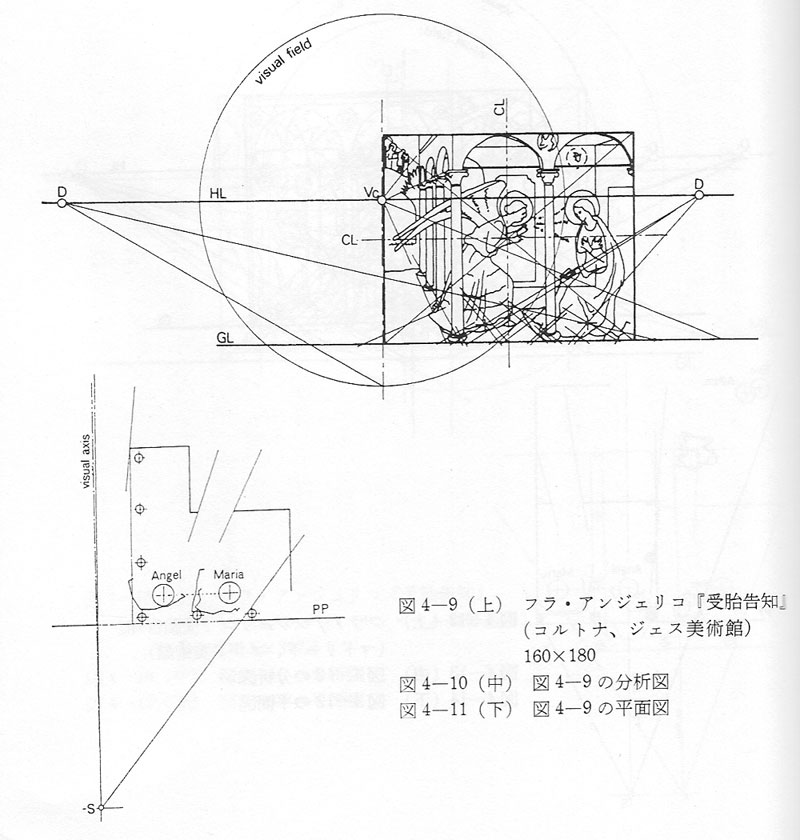 …柱廊の左側面の奥行方向の線を延長すると、画面左辺の外、ほとんどそれに接するあたりに消失点ができる(図4−10)。左方へ偏した一点透視である。視野の円を描いてみると、天使は円内に完全に含まれているが、マリアは円外になる。…(中略)…この絵画空間の平面図は、図示のとおりである(図4−11)。