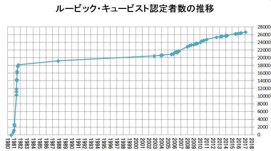 ルービックキューブが発売された1980年7月から2017年3月までの期間のルービック・キュービストの認定者数は以下のとおり。(クリックで拡大)