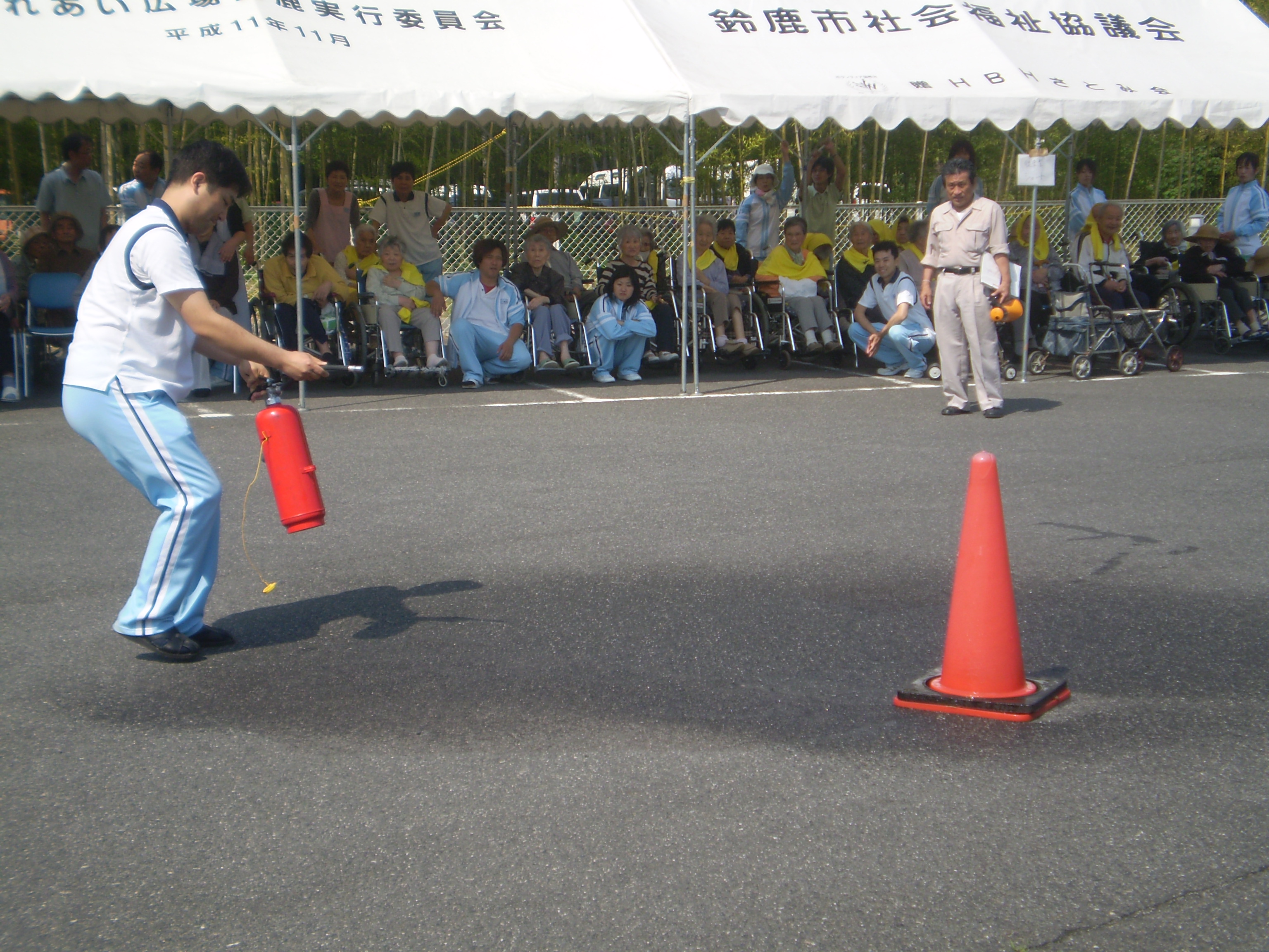 今回は、水が入った消火器を使用し、