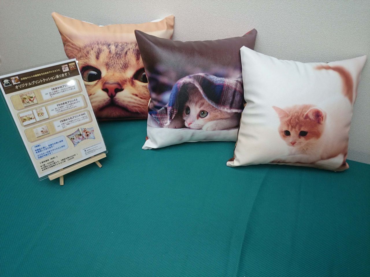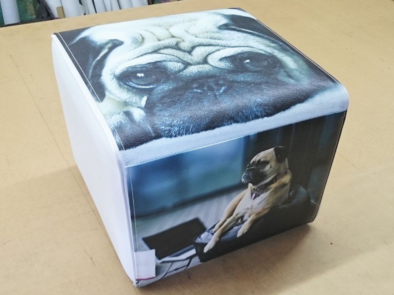2016年10月09日 合皮レザーで作ったオリジナルプリントクッション 全面にプリントを施した合皮レザーオリジナルプリントクッション。中身のクッションの交換もできるようファスナーを取り付けました。布に比べ肌触りも良く、頑丈に出きていおり、汚れも拭き取り易くなっております。